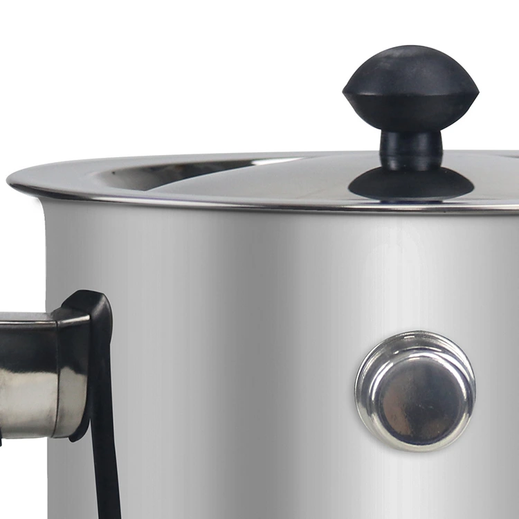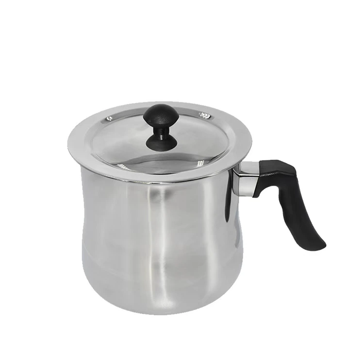 For det første det varmebestandige håndtag: Gryden er udstyret med et robust, varmebestandigt håndtag, som er designet til at passe hånden komfortabelt, så brugerne nemt kan holde og flytte gryden uden at blive skoldet, hvilket sikrer sikker betjening. Håndtaget er fast forbundet til grydekroppen, ikke let at løsne, hvilket sikrer langvarig brugssikkerhed. For det andet, det rustfri stållåg: Gryden er udstyret med et gennemsigtigt rustfrit stållåg, som giver brugerne mulighed for tydeligt at observere tilstanden af ​​materialerne indeni (såsom vokssmeltning, chokoladesmeltning, mælkekogning) uden at åbne låget, undgå varmetab og materialesprøjt og lette realtidskontrol af forarbejdningsprocessen.