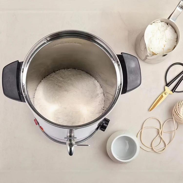 Nanjing FNAT er en fabrik med oprindelse i Kina, der er specialiseret inden for stearinlysråmaterialer. Vores professionelle vokssmelteudstyr er udelukkende designet til vokssmeltning, fremstillet af fødevaregodkendt 304 rustfrit stål med flere kapaciteter (5L, 8L, 10L, 12L, 15L, 25L, 35L, 45L osv.). Den har internationale stikmuligheder, en vokshane, der ikke tilstopper og er nem at rengøre, temperaturkontrol, dobbeltlagsisolering og tredimensionel opvarmning i fuld chassis for hurtig hastighed og høj termisk effektivitet. Stabil i kvalitet, det kombinerer professionalisme og praktisk anvendelighed, velegnet til storskala stearinlysproduktion og industriel brug.
